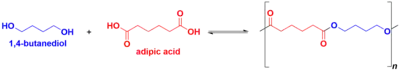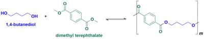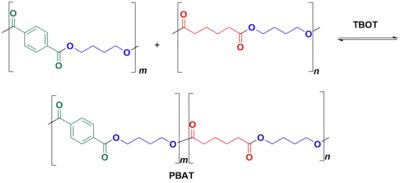 Adipic acid and 1,4-butanediol are polymerized to create their polyester (plus water). DMT and 1,4-butanediol are also reacted to form their polyester (plus methanol). This polyester is then added to the butylene adipic acid polyester by using tetrabutoxytitanium (TBOT) as a transesterification catalyst; an overabundance of 1,4-butanediol influences chain lengths. The result is a copolymer of the two previously prepared polymers.