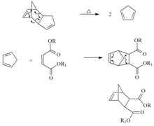 In unsaturated polyester (UPR) chemistry, unsaturation sites are present along the chain, usually by incorporation of maleic anhydride, but maleic acid and fumaric acid are also used. Maleic acid and fumaric acid are isomers where maleic is the cis-isomer and fumaric is the trans-isomer. The ester forms of these two molecules are maleate and fumarate, respectively. When curing a UPR, the fumarate form is known to react more rapidly with the styrene radical, so isomerization catalysts, such as N,N-dimethylacetoacetamide (DMAA), are often employed in the synthesis process which converts the maleates into fumarates; the isomerization can also be encouraged with increased reaction time and temperature. Within the UPR industry, the classification of the resins is generally based on the primary saturated acid. For example, a resin containing primarily terephthalic acid is known as a Tere resin, a resin containing primarily phthalic anhydride is known as an Ortho resin, and a resin containing primarily isophthalic acid is known as an Iso resin. Dicyclopentadiene (DCPD) is also a common UPR raw material, and can be incorporated two different ways. In one process, the DCPD is cracked in situ to form cyclopentadiene which can then be reacted with maleate/fumarate groups along the polymer chain via a Diels-alder reaction. This type of resin is known as a Nadic resin and is referred to as a poor man's Ortho, due to sharing many similar properties of an Ortho resin along with the extremely low cost of DCPD raw material. In another process, maleic anhydride is first opened with water or another alcohol to form maleic acid and is then reacted with DCPD where an alcohol from the maleic acid reacts across one of the double bonds of the DCPD. This product is then used to end-cap the UPR resin which yields a product with unsaturation on the end-groups. This type of resin is referred to as a DCPD resin.