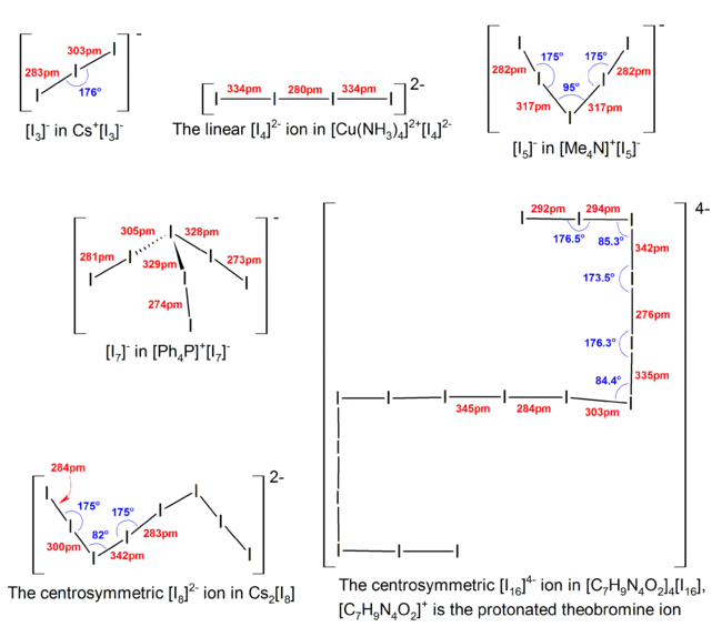 3 units. Discrete polyiodides are usually linear. The more complex two- or three-dimensional network structures of chains and cages are formed as the ions interact with each other, with their shapes depending on their associated cations quite strongly, a phenomenon named dimensional caging.[4][5] The table below lists the polyiodide salts which have been structurally characterized, along with their counter-cation.[6]