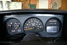The Grand Am included Strato bucket seats upholstered in Naugahyde vinyl or corduroy cloth featuring manual recliners and adjustable lumbar supports - both features common on European-style sports/luxury sedans, but unusual for American cars of that time. Also included were an instrument panel from the Pontiac Grand Prix featuring a Rally gauge cluster with fuel, oil, water and volt gauges (a tachometer or fuel economy gauge was optional, and on cars so equipped, the clock was moved to a space on the lower instrument panel under the radio), three-spoke padded steering wheel with brushed-stainless spokes, and Genuine Crossfire African Mahogany trim on the dash facing, radio and clock surrounds, as well as the center console between the front seats.[11][12] Grand Ams also were among the first U.S.-built cars with a turn-signal mounted headlight dimmer switch that had been common on imported cars for decades.[13] Other standard equipment included concealed windshield wipers, a 1.12 in (28 mm) front stabilizer bar, and an in-the-windshield radio antenna.[3] Upscale options included air conditioning, tinted glass, power windows-locks-seat, rear defogger, various sound systems, and tilt-steering-wheel. AM/FM stereo with a tape player was optional.[3] The listed retail price for the 2-door coupe was US$4,264 ($28,109 in 2022 dollars [14]), listing it above the Firebird Trans Am.[3]