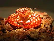 Porcellana sayana is a species of porcelain crab that lives in the western Atlantic Ocean, often as a commensal of hermit crabs. It is red with white spots, and has a characteristic bulge behind each claw.