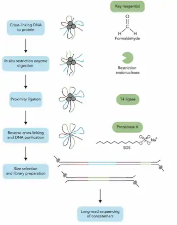 Cross-linking generates loops of DNA, with each loop arising from a separate locus.[5] To capture long-range interactions between distant loci, potentially from different chromosomes, these loops are first cut and then re-joined back together based on proximity. Although fragments deriving from the same loop may reanneal back together, sometimes fragments from separate loops will ligate together, thus creating chimeric sequences.[5] The cutting and rejoining of DNA is achieved by the in situ restriction enzyme digestion and proximity ligation steps respectively. Specifically, a restriction endonuclease cuts the DNA to create free ends, whereas T4 ligase is used to join fragments together.[5] Ultimately, these steps result in genomic loci close together in physical space being linked together on contiguous DNA segments referred to as concatemers.[2]