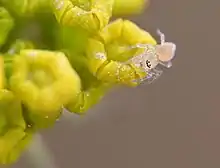 A macro shot of a very tiny spider Porrhoclubiona leucaspis on a fennel flower photographed in April 2022 in Malta