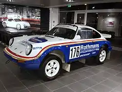The Porsche 953 was a heavily modified variant of the 911, designed and built specifically to compete in the 1984 Paris–Dakar Rally. It was a short lived model, as it was replaced in 1985 by the 959. It is sometimes referred to as the 911 4x4, as it used the developmental, manually controlled four-wheel drive system that was intended to be used on the 959. Travelling on an extremely enhanced suspension, powered by a 300 bhp (224 kW), 6-cylinder engine, and weighing in at 2,750 lb (1,247 kg), it was extremely successful. Three of them were entered into the Paris-Dakar Rally, one taking overall first place.[1]