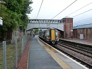 Port Glasgow is the only station on the Inverclyde Line where all passenger services stop.[3] There are five trains per hour from the station eastbound on weekday & Saturday daytimes to Paisley & Glasgow Central – four originate from Gourock and one from Wemyss Bay. Three of these are limited stop (including that from Wemyss Bay), whilst the others call at all intermediate stations en route. Westbound, the same frequency operates – hourly to Wemyss Bay, 2 per hour fast to Greenock Central and then all stations to Gourock and 2 per hour that stop at all stations to Gourock. In the evening, there are two trains per hour to Gourock, one to Wemyss Bay and three to Glasgow Central, whilst on Sundays there is a half-hourly service to Glasgow and hourly to both Gourock & Wemyss Bay.[4] Most trains are now operated by Class 380 EMUs.