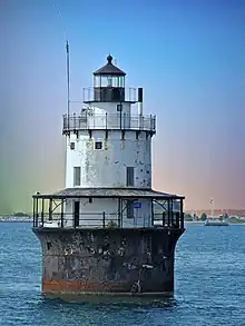 Just south of Palmer's Island, beginning near Fort Phoenix in Fairhaven, is the harbor's hurricane barrier, built by the Army Corps of Engineers in the 1960s. It is 9,100 feet long and twenty feet above median sea level, and is the largest stone structure on the East Coast. The harbor section has two 440-ton gates in the center that can be closed to protect the port during strong tides or storm surges. A walkway allows for pedestrian access.[3][4] In 2020, it was struck by a ship departing the harbor.[5]