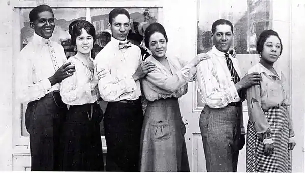 Jelly Roll Morton (third from left), Ada "Bricktop" Smith (next), Los Angeles, California, at the Cadillac Club, c. 1917 or 1918