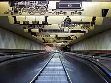 Looking down the MBTA's longest escalator, at Porter station. This escalator runs from the fare mezzanine to the inbound subway platform level. The overhead graphics theme commemorates early railroad history.