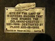 This plaque was placed on the Portland side of the bridge to commemorate the covered bridge destroyed by the remnants of Hurricane Diane in August 1955.