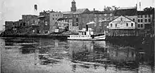 In 1774, in the lead-up to the Revolution, Paul Revere rode to Portsmouth warning that the British Royal Navy was coming to capture the port.[5] Although Fort William and Mary protected the harbor, the Patriot government moved the capital inland to Exeter, which ensured that it would be under no threat from the Royal Navy, which bombarded Falmouth (now Portland, Maine) instead on October 18, 1775. Portsmouth was the destination for several of Beaumarchais's ships containing materiel, such as artillery, tents, and gunpowder, to help the American revolutionary effort.[6] African Americans helped defend Portsmouth and New England during the war. In 1779, 19 enslaved African Americans from Portsmouth wrote a petition to the state legislature and asked that it abolish slavery, in recognition of their war contributions and in keeping with the principles of the Revolution.[4] The legislature tabled their petition. New Hampshire abolished slavery in 1857, by which time the institution was effectively extinct in the state.
