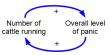 Causal loop diagram that depicts the causes of a stampede as a positive feedback loop. Alarm or panic can sometimes be spread by positive feedback among a herd of animals to cause a stampede.