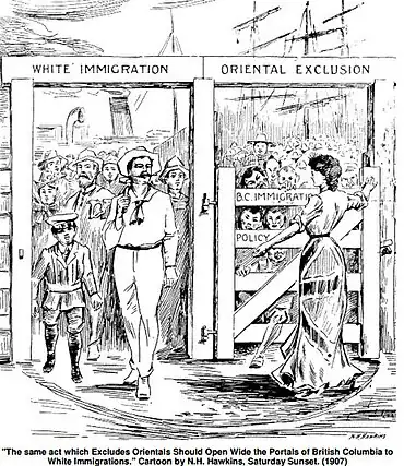 - ↑ For detail see Roy, Patricia (1990). A White Man's Province: British Columbia Politicians and Chinese and Japanese Immigrants, 1858-1914. University of British Columbia Press. ISBN 978-0-7748-0373-1.