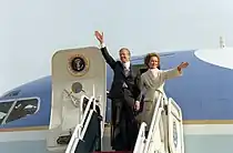 In March 1981, Carter cited his choice to refrain from critiquing Reagan was due to not enough time having passed within his tenure and predicted the "next few months" would see programs from his administration be viewed more favorably by the public.[8] On March 31, after the attempted assassination, Carter said danger was a consistent part of being president and President Reagan's public appearances would not be curtailed.[9] On May 8, while delivering a speech in Independence, Missouri, Carter critiqued "those who argue that the main business of government is to do nothing", the comment being seen as a reference to the Reagan administration.[10] In a September 3 press conference, Carter confirmed that he was in agreement with Reagan on building neutron arms in the wake of the Soviet invasion of Afghanistan but said he hoped that when the Soviet Union "is willing to implement the termination of aggression and move towards peace and the control of nuclear weapons our country will be ready to cooperate with them completely as we have been in the past."[11] In October, Carter traveled to Washington for the lobbying of senators in support of providing Saudi Arabia with Awacs radar surveillance aircraft and said he believed the Reagan administration was not doing enough in the Middle East.[12]