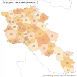 2-digit postcode areas of Armenia (defined through the first two postcode digits)