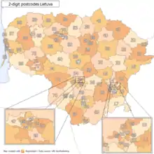 2-digit postcode areas Lithuania (defined through the first two postcode digits)