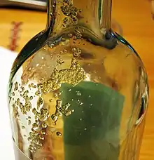 Potassium bitartrate has a low solubility in water. It crystallizes in wine casks during the fermentation of grape juice, and can precipitate out of wine in bottles. The rate of potassium bitartrate precipitation depends on the rates of nuclei formation and crystal growth, which varies based on a wine's alcohol, sugar, and extract content.[6] The crystals (wine diamonds) will often form on the underside of a cork in wine-filled bottles that have been stored at temperatures below 10 °C (50 °F), and will seldom, if ever, dissolve naturally into the wine. Over time, crystal formation is less likely to occur due to the decreasing supersaturation of potassium bitartrate, with the greatest amount of precipitation occurring in the initial few days of cooling.[6]
