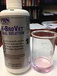 Potassium bromide is used in veterinary medicine to treat epilepsy in dogs, either as first-line treatment or in addition to phenobarbital, when seizures are not adequately controlled with phenobarbital alone.[5] Use of bromide in cats is limited because it carries a substantial risk of causing lung inflammation (pneumonitis) in them. The use of bromide as a treatment drug for animals means that veterinary medical diagnostic laboratories are able as a matter of routine to measure serum levels of bromide on order of a veterinarian, whereas human medical diagnostic labs in the US do not measure bromide as a routine test.