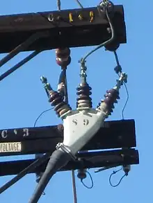 A pothead is a type of insulated electrical terminal used for transitioning between overhead line and underground high-voltage cable or for connecting overhead wiring to equipment like transformers.[1] Its name comes from the process of potting or encapsulation of the conductors inside the terminal's insulating bushing.