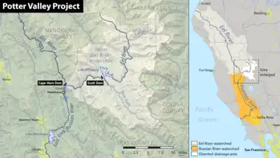 The Potter Valley Project is an hydroelectric project in Northern California in the United States, delivering water from the Eel River basin to turbines in the headwaters of the Russian River.[1] The project is owned and operated by Pacific Gas and Electric Company (PG&E). The main facilities are two dams on the Eel River, a diversion tunnel and hydroelectric plant.[2] Average annual throughput is 159,000 acre⋅ft (196,000,000 m3), although this figure varies significantly with both the amount of precipitation in the Eel River basin and the demand on the Russian River.[3]
