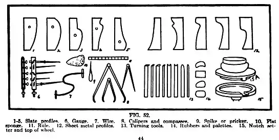 A diagram of studio pottery tools for turning and shaping, including a pottery gauge (labeled as 6 in the figure), from Frederick Hurten Rhead's self-illustrated 1910 book, Studio Pottery.