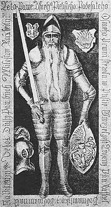 In the grave of Rafael a silver club was discovered from which a chalice was made. This was (in 1901) still in possession of the church. The chalice has the following inscription: "ARCUM SZUCSA SOLIS AEQUARI CURAVIT FERDINANDUS L 1528". The marble monument of Rafael Podmanitzky in Považská Bystrica is of interest because it has an inscription all around in old Slovak language it says "LETA PANIE TISICEHO PIETISTEHO PADESATEHO OSMEHO PRWNI STRZEDU W PUSTIE UMRZEL GEST UROZENY PAN RAFFAEL PODMANITZKY Z PODMANINA JEHOZ DUSSY PAN BUOH MILOSTIW RACZ BIETI ". The monument is on the right side wall of the Roman Catholic Church not far from the “Galerie”. It depicts a very tall man in full armor. The facial features are clearly chiseled in the stone.