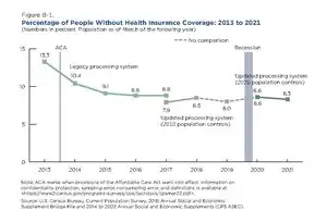 The United States government has passed acts to make healthcare more accessible.[46] Though it does not have universal health coverage, the country has two forms of public insurance, Medicare and Medicaid. Medicare is insurance for those who are over 65 or have long-term disabilities or end-stage renal disease.[46] Medicaid allows for federal funding to match health care services and allow low-income families, low-income pregnant women, low-income children up to 18 years old, the blind, and those with disabilities to have these services.[46] Medicaid is administered by states, so states have the right to set the criteria for eligibility. According to The Commonwealth Fund website, Medicaid now covers 17.9% of Americans. The Children's Health Insurance Program (CHIP) provides insurance to children in low-income families and covers 9.6 million children, according to The Commonwealth Fund.[46] The Affordable Care Act was passed in 2010, and it expanded Medicaid eligibility and provided funding for federally qualified health centers. These centers take patients regardless of ability to pay and provides free vaccines to uninsured and underinsured children.[46] Community mental health services are also funded by the federal government through grants provided to states by the Substance Abuse and Mental Health Services Administration.[46]
