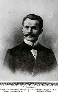 Povilas Jakubėnas (April 11, 1871 – May 30, 1953) was a Lithuanian Calvinist clergyman, general superintendent of the Lithuanian branch of the Reformed Church during the interbellum, professor of theology, Lithuanian book smuggler (knygnešys) during his student times.[1][2][3][4]
