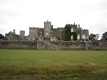 Powderham Castle is a fortified manor house situated within the parish and former manor of Powderham, within the former hundred of Exminster, Devon, about 6 miles (9.7 km) south of the city of Exeter and 1⁄4 mile (0.4 km) north-east of the village of Kenton, where the main public entrance gates are located.[2] It is a Grade I listed building. The park and gardens are Grade II* listed in the National Register of Historic Parks and Gardens.[3]