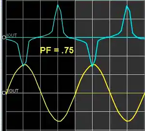 Sinusoidal voltage and non-sinusoidal current give a distortion power factor of 0.75 for this computer power supply load.