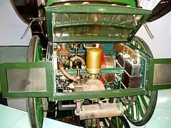 The Präsident was an automobile manufactured by the Nesselsdorfer Wagenbau-Fabriks-Gesellschaft (Nesselsdorf or NW), now Tatra, in 1897. It was the first practical, factory-produced petrol engine automobile built in Central and Eastern Europe[4] (Siegfried Marcus's earlier cars were experimental and not practical). It was constructed by Leopold Sviták and Hans Ledwinka. The automobile was more of a carriage without horses than a car in modern sense. The car is steered via handlebars (while most of the cars of the era had a tiller). The wooden bodywork is placed on an iron frame. It has four seats and a convertible top that would cover only the rear seats. Both axles have suspension of semi-elliptical leaf springs. The wheels were similar to the ones of a horse carriage, but had rubber tyres. The car had a two cylinder spark ignition Benz engine placed by the rear axle.