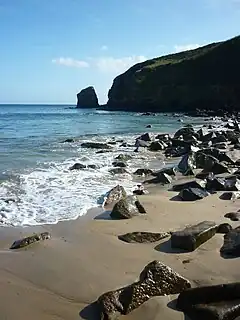 Praa Sands (Cornish: Poll an Wragh = Salt Pool of the Wrasse),[1][2] (formerly Prah Sands) commonly pronounced pray or prah, is a white-sand beach and coastal village in Cornwall, England. It is in the parish of Breage and lies off the A394 road between Helston and Penzance.[3] Formerly serving the local mining industry, it is now mostly a tourist-orientated area. The beach is popular with surfers and walkers. Towards the south eastern end of the beach is a WW2 Type 24 pillbox. Originally this was constructed on top of the cliffs but it has been subjected to coastal erosion and has settled down onto the beach.