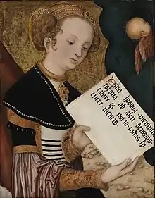 - ↑ Lucas Cranach Archive: Prague Altarpiece [left wing, fragment]: Female saint (Agnes?) with a page