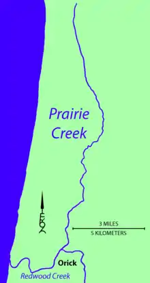 Prairie Creek is the Redwood Creek tributary drainage basin including the inland portion of Prairie Creek Redwoods State Park. Prairie Creek drains southerly through a Plio-Pleistocene non-marine sedimentary and metasedimentary formation to a confluence with Redwood Creek approximately one mile upstream of Orick, California. The southern half of the channel exposes the Franciscan Assemblage and the lower reaches flow through Quaternary alluvium of the Redwood Creek estuarine floodplain. Prairie Creek was closely followed by U.S. Route 101 from Orick to the Klamath River drainage divide.[2] The former highway alignment through the park has been designated the Newton B. Drury Scenic Parkway; through traffic now follows a new alignment along the easterly drainage basin headwall.[3]