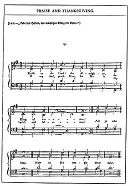 "Praise to the Lord, the Almighty" is a Christian hymn based on Joachim Neander's German-language hymn "Lobe den Herren, den mächtigen König der Ehren", published in 1680.[2] John Julian in his A Dictionary of Hymnology calls the German original "a magnificent hymn of praise to God, perhaps the finest creation of its author, and of the first rank in its class."[3]