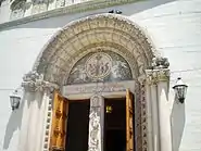 The current church building stands on a v-shaped corner of Occidental Blvd. and Hoover St., dedicated in November 1926. It is an Italian Romanesque structure. The church has three rose windows that offer a dim and religious life. Twelve large stained glass windows, six yellow windows and the Stations of the Cross Mosaics are over the nave.[1] The church structure is entirely made of poured concrete. The ceiling beams are painted to look like wood, but are actually concrete. The church was remodelled in 1951 by Wallace Neff who commissioned Millard Sheets to create the mosaics in the apse. Neff also added a parish hall.[5]