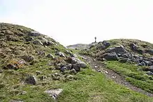The remains of the entrance into Birka with the cross of St Ansgar in the background.