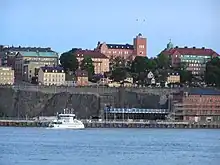 2. A bailey and a larger building located on a pair of islets now part of Helgeandsholmen accompanied by a row of poles forming a barrier in the strait (i.e. the "lock" of Lake Mälaren).