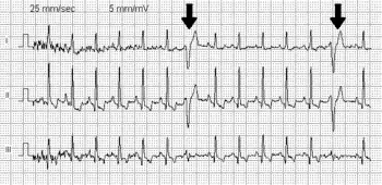 | A premature ventricular contraction on an EKG, marked by the arrow | |