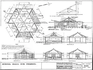 Kevin Borland Hall (1962) The first building Kevin Borland designed for the school was the 'Preshil school hall', later renamed to 'Kevin Borland Hall', constructed in 1962. It was designed for multi-purpose use and with its octagonal shape it was a clear departure from the usual nave-like school halls. It is most famous for its intricate octagonal timber roof structure with skylights. It has wooden beams that span both the hall and the sheltered bays outside of it. The roof is clad in steel deck, and the walls are built of grey concrete blocks.[5] In 1959 Kevin Borland and Geoff Trewenack designed glazed pyramidal skylights in the McCarthy-house that acted as a precedent of the roof structure at the Preshil school hall.[6]