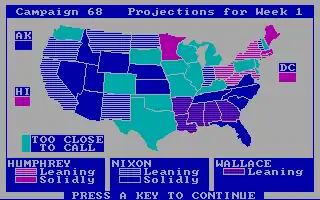 The game can be played with either two or three candidates (for example, the "Historical" scenarios for 1968 and 1980 include third party candidates George C. Wallace and John Anderson, respectively, and "Ahistorical" scenarios for any year can include the addition of a third party candidate), and the computer can control any or all of the candidates (thus allowing for the possibility of a non-player, straight simulation of an electoral scenario), meaning the game can be played by one, two, or three players.