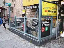 The President Street–Medgar Evers College station (originally President Street station) is a station on the IRT Nostrand Avenue Line of the New York City Subway. Located at the intersection of President Street and Nostrand Avenue in Brooklyn, the station is served by the 2 train at all times and the 5 train on weekdays.
