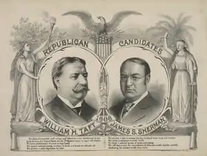 Assistant Postmaster General Frank H. Hitchcock resigned from his office in February 1908 to lead the Taft effort.[63] In April, Taft made a speaking tour, traveling as far west as Omaha before being recalled to straighten out a contested election in Panama. He had no serious opposition at the 1908 Republican National Convention in Chicago in June, and gained a first-ballot victory. Yet Taft did not have things his own way: he had hoped his running mate would be a midwestern progressive like Iowa Senator Jonathan Dolliver, but instead the convention named Congressman James S. Sherman of New York, a conservative. Taft resigned as Secretary of War on June 30 to devote himself full-time to the campaign.[64][65]