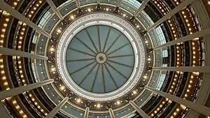 The Cihannuma (World Atlas) Hall, decorated with 16 columns representing the 16 Great Turkic Empires, houses a collection of 200,000 books and has a seating capacity for 224 readers at a time in an area of 3,500 square meters.[2] The dome of the Cihannuma Hall is 32 meters high and 27 meters wide.[9]