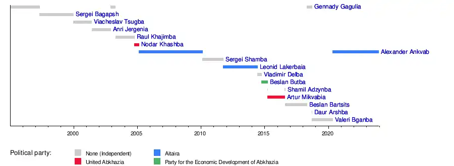 While the presidency was held by one man – Vladislav Ardzinba – from 1994 to 2005, the position of prime minister changed hands a number of times during that time. It was created with the November 1994 adoption of the Constitution of Abkhazia, and Gennady Gagulia was appointed to the position in January 1995.