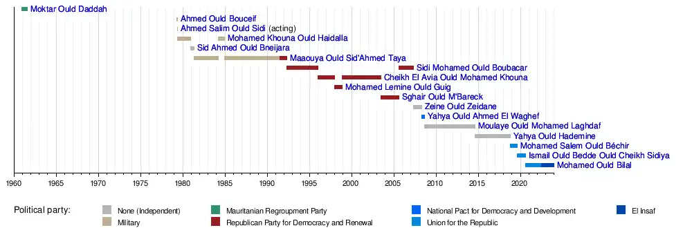 A total of sixteen people have served as Prime Minister of Mauritania (not counting one Acting Prime Minister). Additionally, three persons, Maaouya Ould Sid'Ahmed Taya, Sidi Mohamed Ould Boubacar and Cheikh El Avia Ould Mohamed Khouna, have served on two non-consecutive occasions.