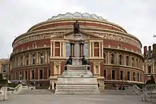 Albert's funeral was held on 23 December 1861 at St George's Chapel, Windsor Castle.[120] His body was temporarily entombed in the chapel's Royal Vault.[121][122] A year after his death, his remains were deposited at the Royal Mausoleum, Frogmore, which remained incomplete until 1871.[123] The sarcophagus, in which both he and the Queen were eventually laid, was carved from the largest block of granite that had ever been quarried in Britain.[124] Despite Albert's request for no effigies of him to be raised, many public monuments were erected all over the country and across the British Empire.[125] The most notable are the Royal Albert Hall and the Albert Memorial in London. The plethora of memorials erected to Albert became so great that Charles Dickens told a friend that he sought an "inaccessible cave" to escape from them.[126]