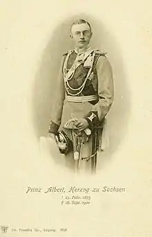 Prince Albert Charles Anthony Louis William Victor of Saxony, Duke of Saxony (German: Albert Karl Anton Ludwig Wilhelm Viktor; 25 February 1875 – 16 September 1900) was a Saxon prince from the House of Wettin. He was the youngest son of King Georg I of Saxony (son of King Johann I of Saxony and his consort Princess Amalie Auguste of Bavaria) and his wife, Infanta Maria Ana of Portugal (daughter of Queen Maria II of Portugal and her consort, Prince Ferdinand of Saxe-Coburg and Gotha-Kohary).