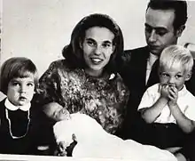 - Prince Aimone of Savoy-Aosta (b. Florence, 13 October 1967);[9] married in a civil ceremony on 16 September 2008, Princess Olga of Greece (b. Athens, 17 November 1971), daughter of Prince Michael of Greece and Denmark and Marina Karella. The religious marriage took place on 27 September 2008 at Patmos. They have three children: