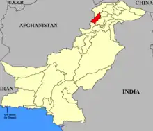 Hunza, also known as Kanjut, was a small princely state to the north of Jammu and Kashmir, and had been subject to the suzerainty of the Maharajah of Kashmir since 1891. In 1931 its population was reported as 13,241.[24] Having once been under Chinese protection, after the departure of the British from the subcontinent in August 1947 Hunza received approaches from the Republic of China, which wished Mir to return to Chinese protection. However, on 3 November 1947, the Mir of Hunza, Mohammad Jamal Khan (1912-1976), who had been ruler only since 1946, sent a telegram to Jinnah stating that he wished to accede his state to Pakistan.[25] This action came one week after the decision by Hari Singh, Maharajah of Kashmir, to accede to India, following the invasion by Pashtun Mehsud tribals, backed by Pakistani paramilitary forces,[26] in October 1947 under the code name "Operation Gulmarg" to seize Kashmir. On 27 October Indian Army troops had moved into Kashmir. Hunza's formal accession took place on 18 November.[27] On 25 September 1973, following local protests, the Mir's rule came to an end when Zulfikar Ali Bhutto, Prime Minister of Pakistan, abolished the Mir's government and annexed the state to the Northern Areas of Pakistan, under the federal government. Two years after his forced abdication the Mir died.