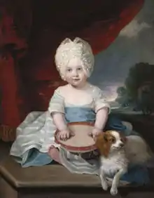 Coming so soon after the death of Prince Octavius and shortly before the end of the war between Great Britain and the United States, Amelia's birth was felt to be a beginning of a new period of hope, and much was expected of her, even from birth.[7] When Amelia was only a month old, Princess Charlotte wrote to her brother William, "Our littlest sister is without exception one of the prettiest children I have ever seen".[4] She was expected to be as beautiful, charming and winning as Octavius, her father's previous favourite child, had been.[4] As a result of her two brothers' deaths, Amelia was seen as her father's favourite.[8][9]